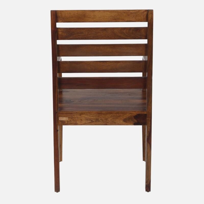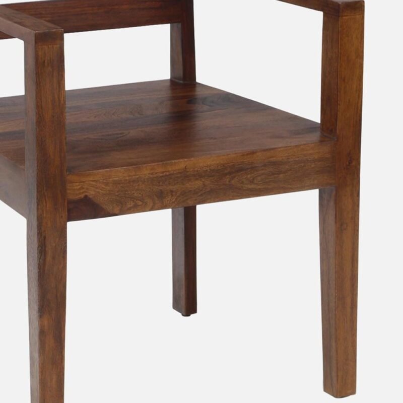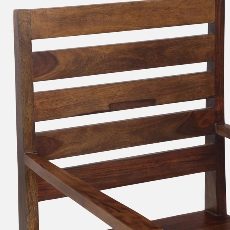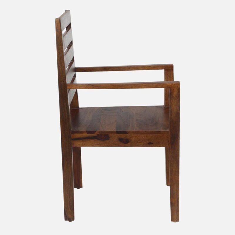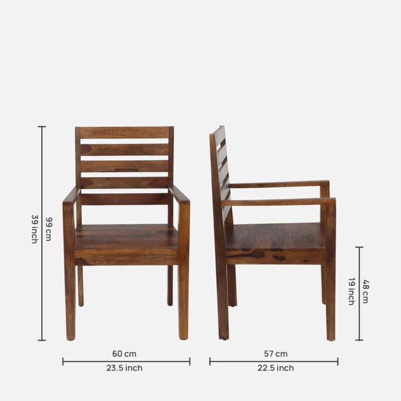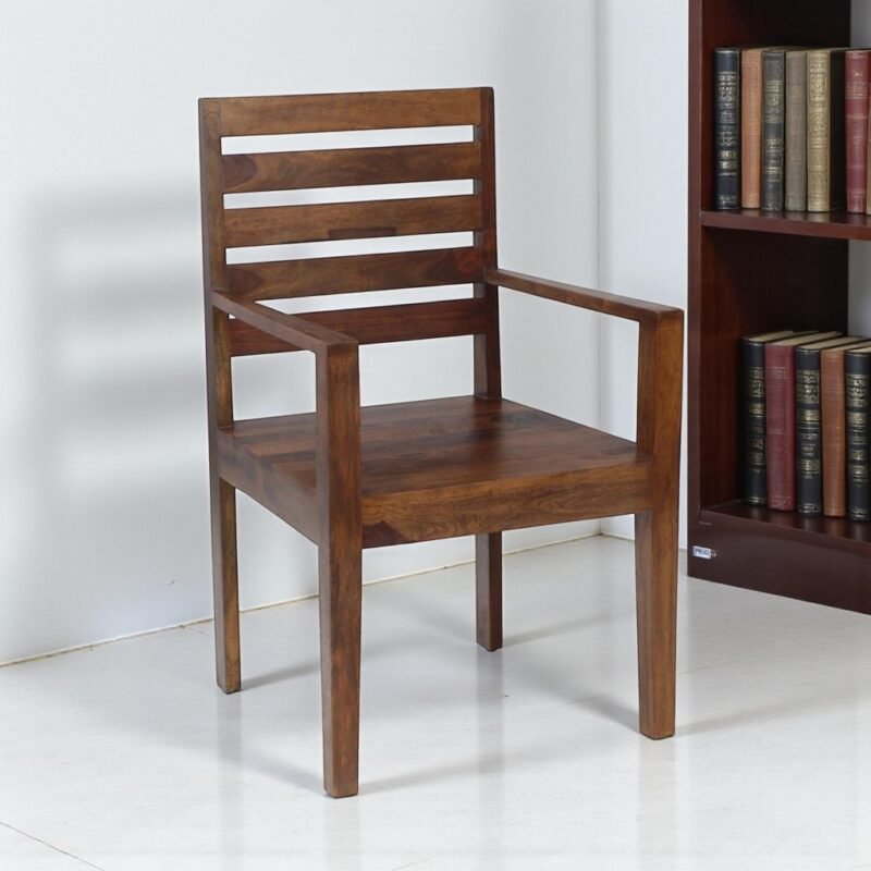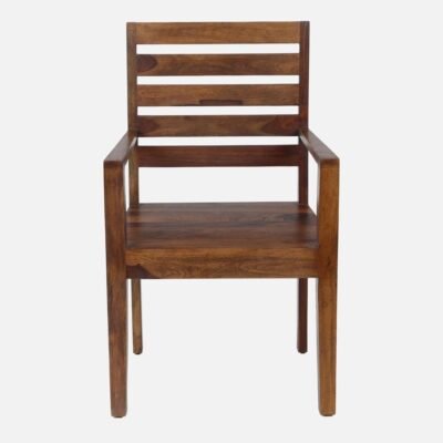 Experience premium comfort with this Solid Sheesham Wood Arm Chair, featuring a bold design with a horizontal slat back and supportive armrests. Finished in a warm Dark Walnut, this chair offers a generous 19-inch seat height and is perfect as an accent chair or a distinguished captain’s chair for your dining set. Its sturdy construction ensures lifelong elegance and durability.