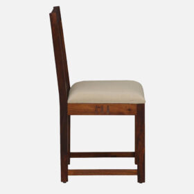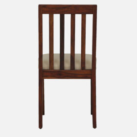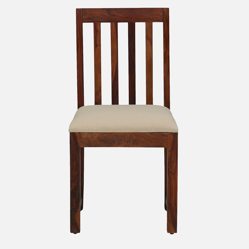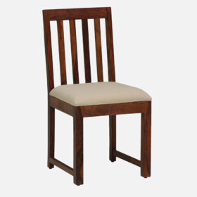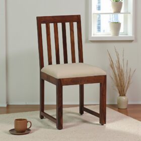 Shop the Solid Sheesham Wood Dining Chair in Dark Walnut. Features a classic slatted back and comfortable beige cushioned seat. Sturdy, durable, and stylish for your dining room. Dimensions: 89 cm H x 44 cm W.