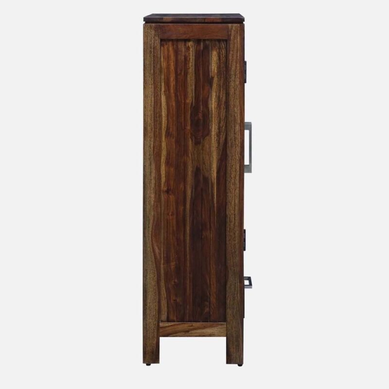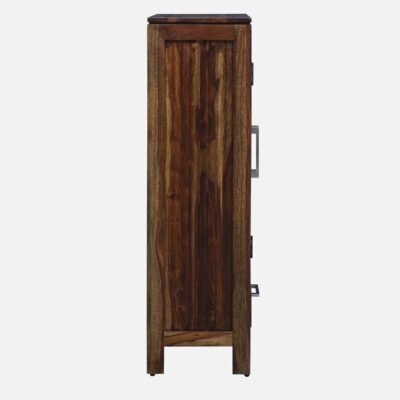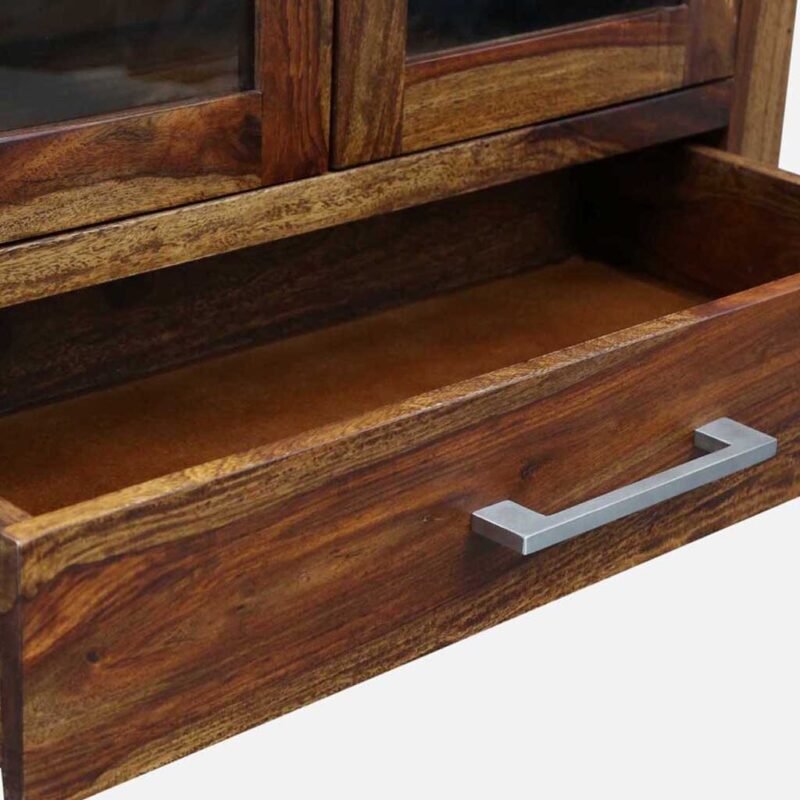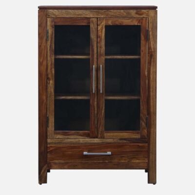 Showcase your treasures with this elegant Solid Sheesham Wood Display Cabinet, featuring two glass doors and a practical storage drawer, all finished in a rich Dark Walnut. Its compact size (47″ H x 31.5″ W) and slim depth make it perfect for smaller spaces, offering both open display and concealed storage in a durable, modern design. Use it as a crockery unit, bookcase, or versatile accent cabinet.