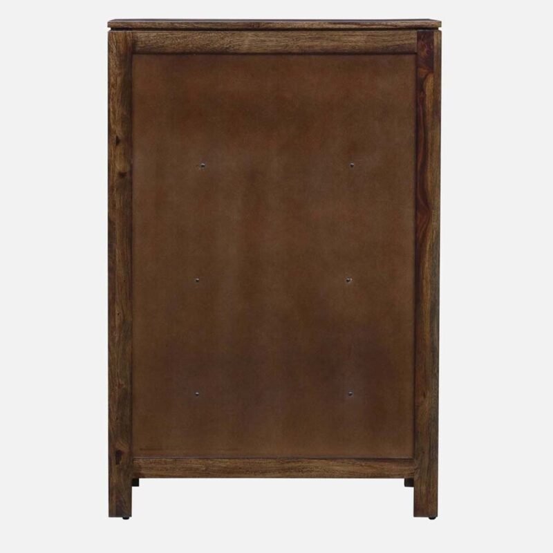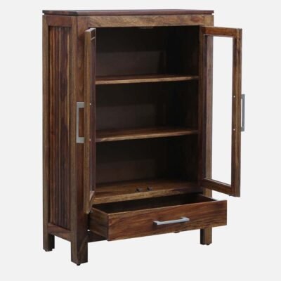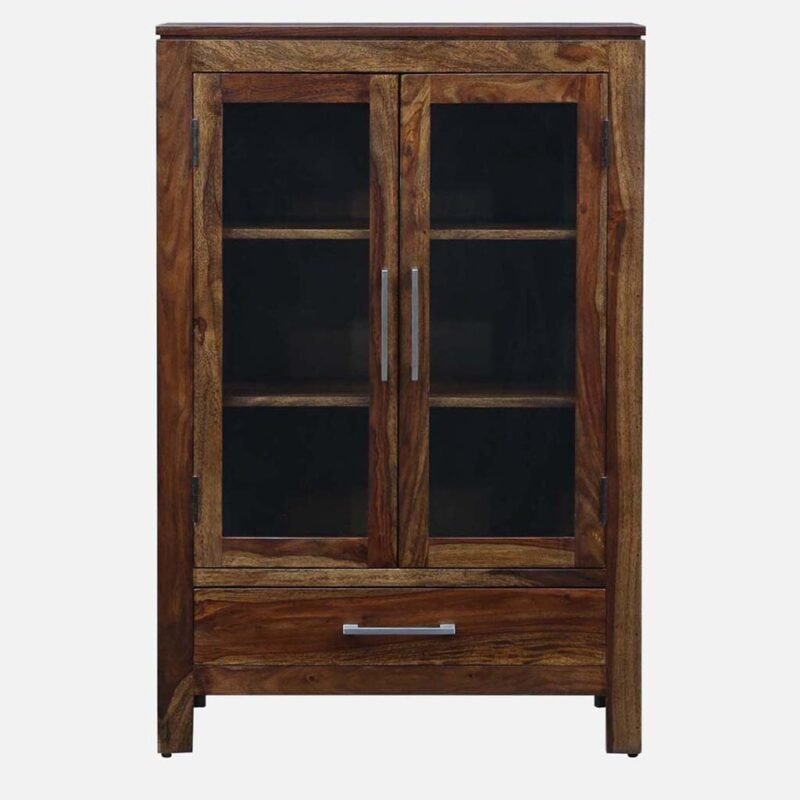| Material | Frame Material: Solid Wood (Likely Sheesham Wood / Indian Rosewood) Door Material: Clear/Tempered Glass Panels set in a Solid Wood Frame |