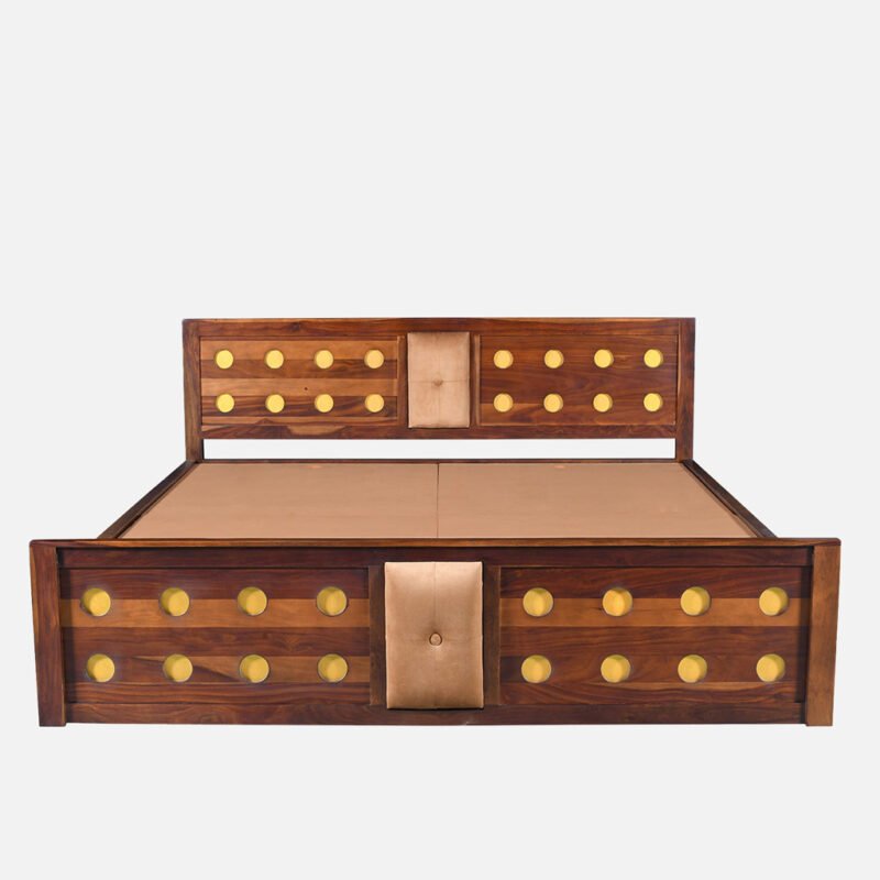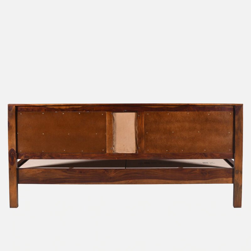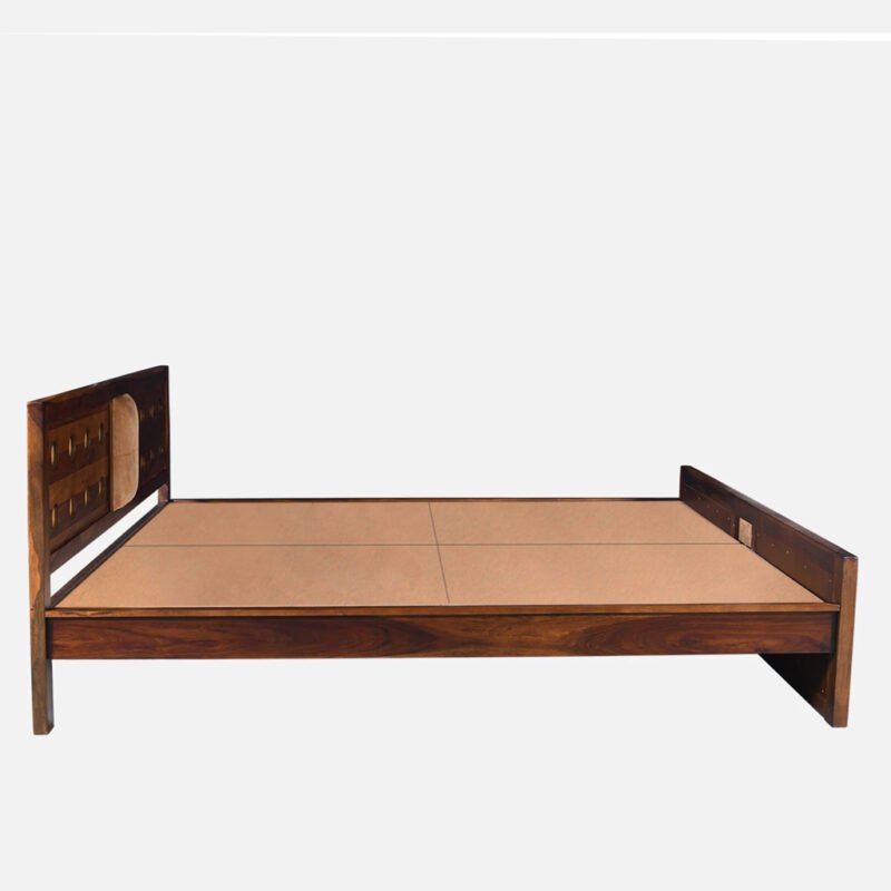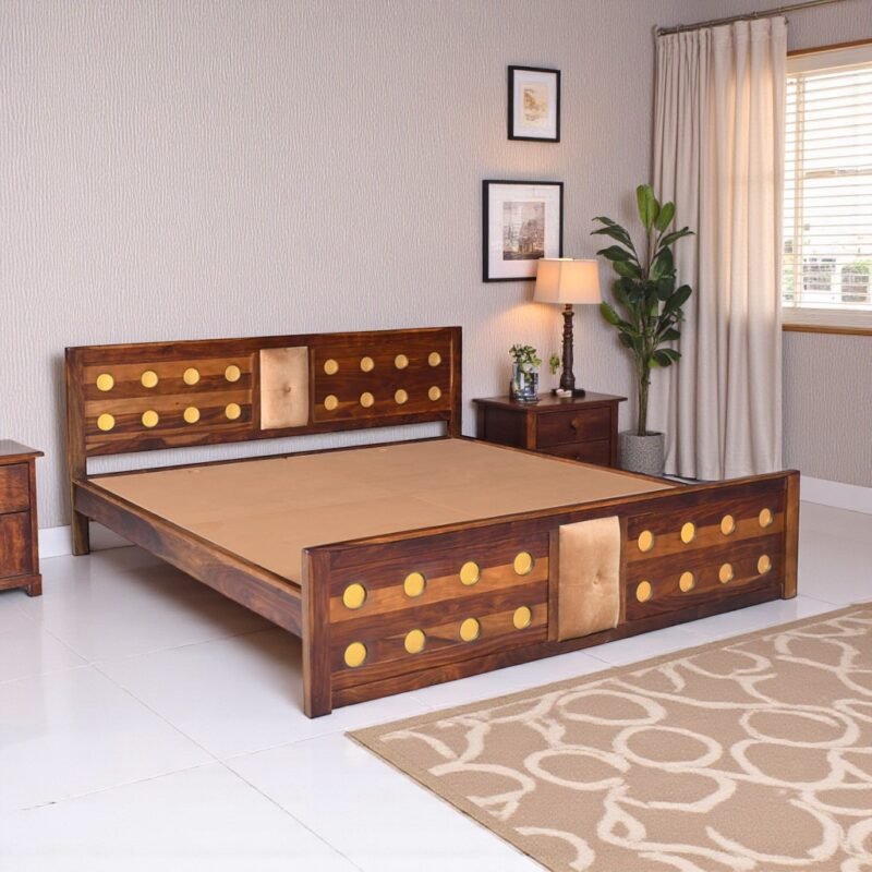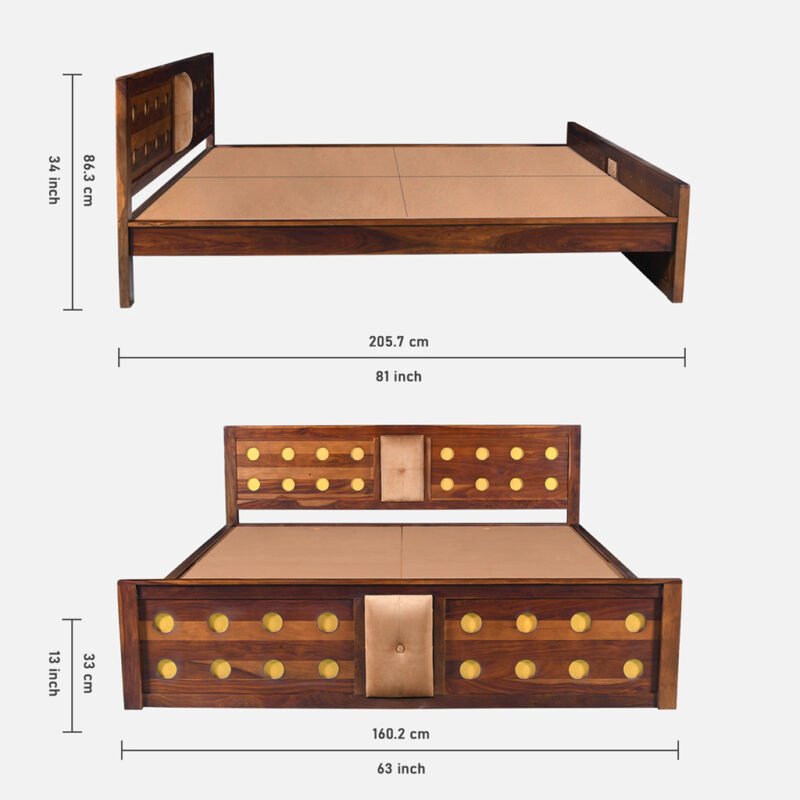 Make a statement with this Solid Sheesham Wood Queen Bed, defined by its bold Mid-Century Modern aesthetic, featuring decorative brass studs and cushioned central panels on both the headboard and footboard. Built from durable solid wood, this 63-inch wide bed offers exceptional stability and adds a touch of unique, retro glamour to your sleeping space. The low profile and rich Dark Walnut finish ensure this bed is a sophisticated and eye-catching centerpiece.